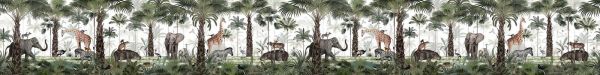 Dit exotische jungletafereel dompelt je onder in een levendige wereld vol wilde dieren en tropische begroeiing. Temidden van hoge palmbomen en dichte plantenpracht bevinden zich giraffen, olifanten, zebra’s, apen, tijgers en kleurrijke vogels. De compositie is rijk aan beweging en speelse interacties: apen klimmen op olifanten, tijgers rusten op een nijlpaard en vogels fladderen tussen het groen. Het kleurenpalet bestaat uit diepe groentinten, warm bruin, zacht beige en natuurlijke schakeringen van grijs en oranje.