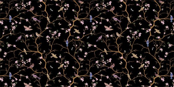 Een dynamisch schouwspel van vogels in diverse houdingen, omlijst door roze bloesems, contrasterend met de donkere achtergrond.