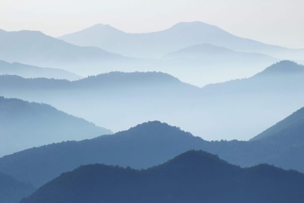 Een berglandschap met mist tussen de bergen. De bergen ziet eruit als blauwe golven.