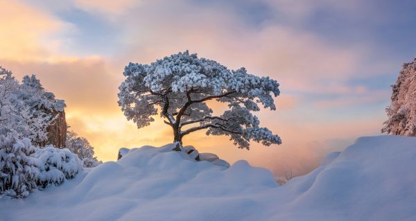Cold loner op fotobehang. Een landschap onder de sneeuw met in het midden een mooie boom.