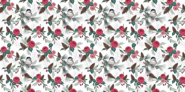 Op deze afbeelding ontvouwt zich een harmonieuze scène van de natuur, waar karmozijnrode bloemen elegant afsteken tegen een zachtgekleurde achtergrond. Statige dennenappels rusten tussen het fijnmazige groen, terwijl vrolijke mezen zich behendig tussen de takken door bewegen. De bescheiden bessen voegen een subtiele zoetheid toe aan het geheel, wat resulteert in een ontwerp dat de rust en schoonheid van een boswandeling uitstraalt.