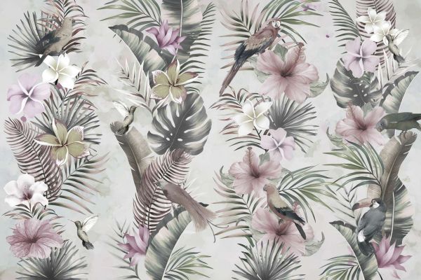 Een exotische samensmelting van levendige bloemen en tropische bladeren, met sierlijke vogels en kolibries die een serene sfeer creëren. De zachte pastelkleuren versterken het gevoel van rust en elegantie.
