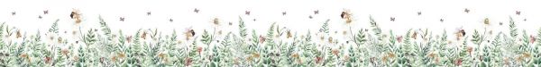Dit sierlijke ontwerp brengt een weelderige bloemenweide tot leven met een overvloed aan zachte groentinten, natuurlijke accenten en warme pastels. Tussen de frisgroene bladeren, varens en stengels bloeien verschillende veldbloemen zoals madeliefjes, margrieten, klaprozen en boshyacinten. Her en der zie je bijen die zich tegoed doen aan de nectar, terwijl vlinders rustig fladderen in de lucht erboven.