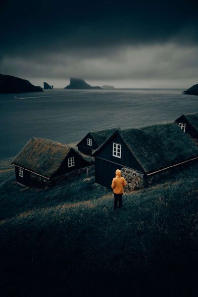 Dit beeld vangt een indrukwekkend moment in een afgelegen, noordelijk landschap. Op een met gras begroeide helling staan drie zwarte huisjes met groene daken, perfect ingebed in de natuurlijke omgeving. Op de voorgrond staat een eenzame figuur in een felgele jas, die uitkijkt over een uitgestrekte fjord onder een dramatisch wolkendek. De kleuren zijn diep en gedempt: donkergroen, blauwgrijs en zwart domineren het beeld, terwijl het warme okergeel van de jas voor een opvallende menselijke toets zorgt.