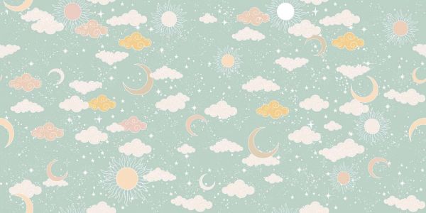 Een zachte hemel vol pastelkleurige wolken, zonnen en maansikkels op een mintgroene achtergrond, omlijst door sprankelende sterren. Een speels en rustgevend tafereel vol fantasie en lichtheid.