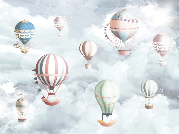 Kleurrijke luchtballonnen met vlaggetjes in de blauwe wolken.