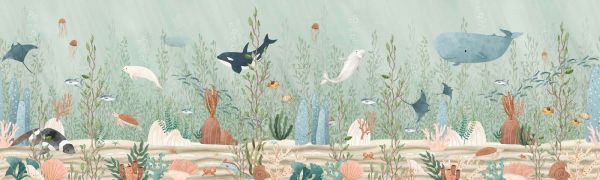 Een speels onderwaterlandschap vol zeedieren zoals walvissen, orka’s, roggen, zeeschildpadden en kleurrijke vissen tussen zacht wiegend zeegras en koraal. Zachte pasteltinten en vloeiende lijnen brengen de oceaan tot leven.