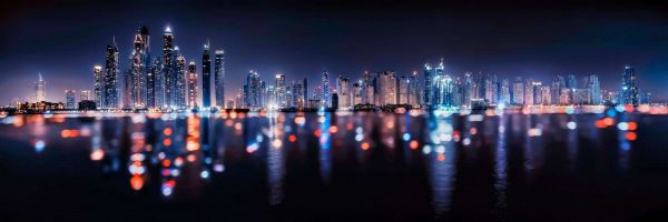 De kleurensamenstelling bestaat uit koelblauwe en paarse tonen, afgewisseld met warme lichtreflecties in oranje en rood. Deze combinatie zorgt voor een dynamisch, energiek en modern gevoel. De vervaagde lichten in de voorgrond geven het beeld een artistieke touch, waardoor het lijkt alsof je de skyline door een lens met zachte focus bekijkt – dit versterkt de dromerige, bijna futuristische uitstraling.