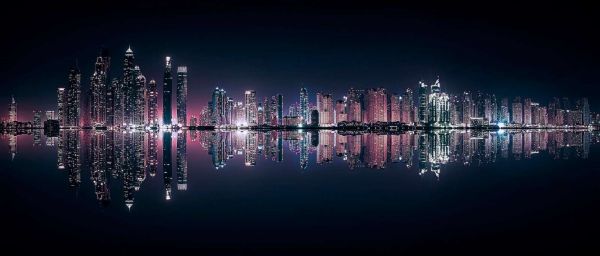 De combinatie van koele nachtblauwe lucht met warme neonaccenten zorgt voor een dynamisch samenspel tussen rust en levendigheid. De verticale lijnen van de wolkenkrabbers contrasteren met de horizontale spiegeling, waardoor een gevoel van balans en ritme ontstaat. De sfeer doet denken aan sci-fi filmscènes of luxe wereldsteden zoals Dubai of Hong Kong bij nacht.
