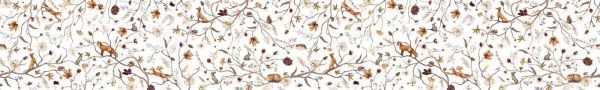 Deze verfijnde illustratie brengt een poëtisch herfstsprookje tot leven. Tussen sierlijke, slingerende takken zitten kleine bosdieren verstopt: vossen balanceren op de takken, eekhoorns springen speels van blad tot blad, konijnen schuilen in het bladerdek, en uilen houden alles rustig in de gaten. Daartussen dwarrelen herfstbladeren, zaaddozen en bloemen in warme tinten als roestbruin, koper, goudgeel en bordeauxrood.