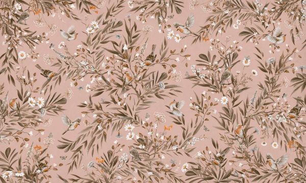 De tinten zijn delicaat en uitnodigend: het roze straalt een gevoel van zachtheid en geborgenheid uit, terwijl de warme bladkleuren en de levendige vogels het ontwerp diepte en karakter geven. Hierdoor past het prachtig binnen een romantisch klassiek interieur of een vintage geïnspireerde stijl. Denk aan sierlijke meubels met ronde vormen, pastelkleurige accessoires, messing details en linnen of fluwelen stoffen.