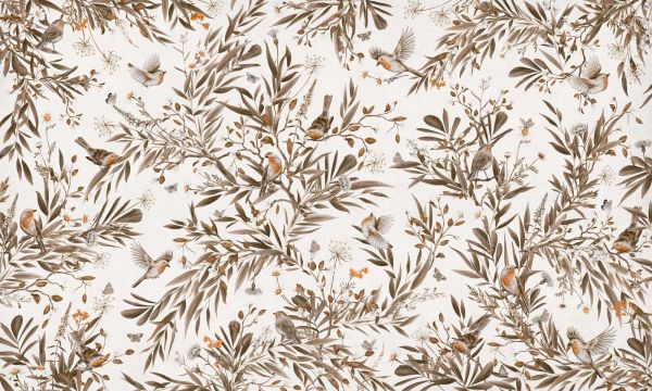 De opbouw van het patroon is vloeiend en organisch, wat zorgt voor een gevoel van rust en ruimte. De vogels zorgen voor een levendig accent, zonder de serene uitstraling te verstoren. Het geheel ademt natuur en vrijheid, alsof je even stilstaat in een zonnige bloemenweide.