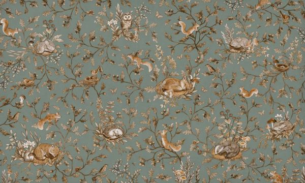 De illustraties zijn verfijnd en rijk aan detail, met een handgetekende uitstraling die doet denken aan klassieke prentenboeken. De herhaling van de takken zorgt voor ritme, terwijl de dieren en bloemen een speels, levendig karakter toevoegen. Het patroon blijft luchtig en zacht, ondanks de rijke vulling met dieren en planten.