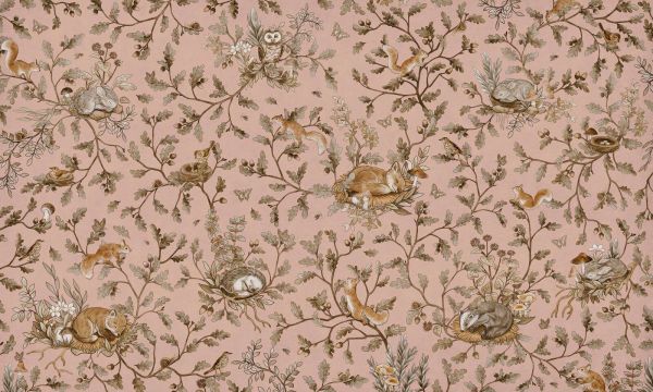 Het kleurgebruik combineert warmbruin en beige met zachte groentinten en een subtiel vleugje geel. Deze harmonieuze tinten komen prachtig tot leven tegen de oudroze achtergrond en creëren een gevoel van geborgenheid en nostalgie. Hierdoor past het ontwerp perfect binnen een romantische kinderkamer, een sprookjesachtige babykamer of zelfs een gezellige leeshoek.
