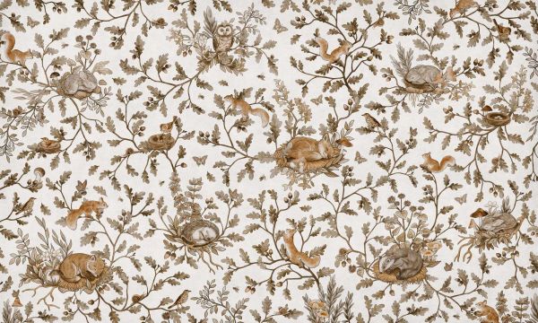 De illustratiestijl is fijnzinnig en gedetailleerd, met een zachte handgetekende uitstraling. De eikentakken zorgen voor structuur en ritme, terwijl de dieren en bloemen zorgen voor een speels, maar gebalanceerd karakter. Het patroon is rijk, maar nooit druk, en nodigt uit tot wegdromen in een fantasierijk bos vol leven.