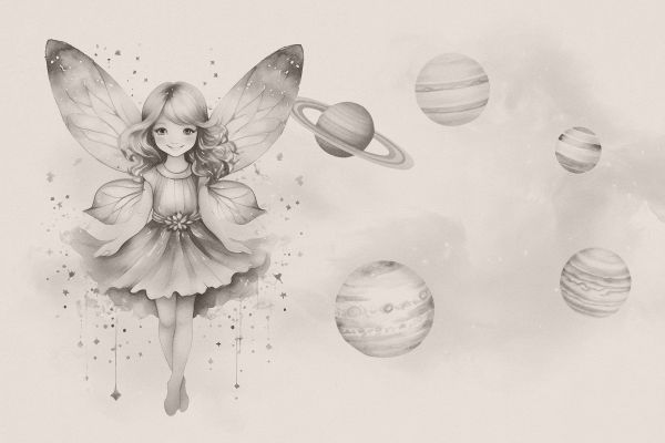 Een dromerig elfje zweeft tussen planeten en sterrennevels in zachte grijstinten. De combinatie van ruimte en fantasie geeft het geheel een kalme, magische uitstraling.