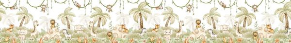 Deze vriendelijke jungle-illustratie brengt een warme, speelse sfeer in elke kinderruimte. Tussen zacht getekende palmbomen en groene lianen spelen en rusten schattige dieren zoals leeuwen, giraffen, olifanten, zebra’s, tijgers, apen en een luiaard. De dieren hebben een lieve, kindvriendelijke uitstraling en zijn verspreid over een dromerig landschap van pastelgroen, beige en zandkleuren.