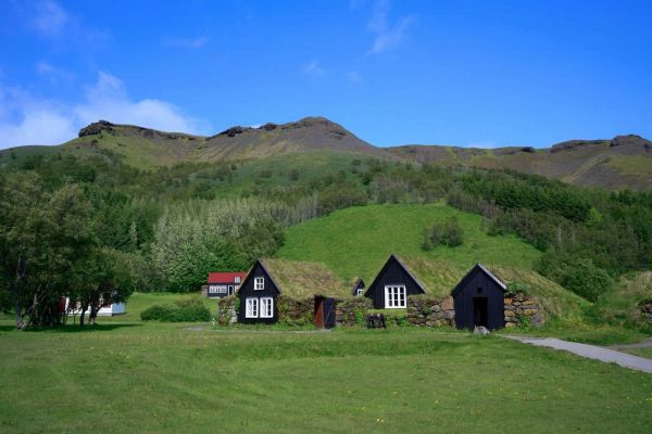 Zwarte huisjes met witte kozijnen en begroeide grasdaken liggen vredig in een groene vallei, omringd door glooiende heuvels, bossen en een helderblauwe lucht. De rustieke sfeer straalt eenvoud en verbondenheid met de natuur uit.