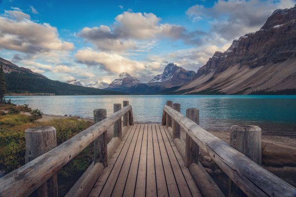 Een houten brug die naar een verlaten strand gaat. Het stand ligt bij een mooi berglandschap.