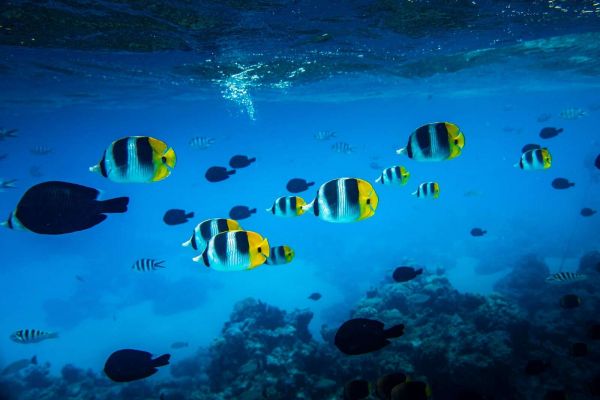 Dit levendige onderwaterbeeld toont een tropisch rif vol leven en kleur. Gele en witte rifvissen met zwarte verticale strepen zwemmen sierlijk tussen silhouetten van donkergekleurde vissen, terwijl de achtergrond geleidelijk vervaagt in het diepe blauw. De lichtval vanaf het wateroppervlak zorgt voor schitterende reflecties op de vissen en de zachte golfing van het koraal. Deze scène ademt helderheid, beweging en de rijke diversiteit van het tropische zeeleven.