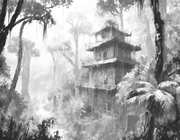 Dit kunstzinnige ontwerp onthult een verborgen boomhut in een dicht, mistig woud. Omgeven door hoge, mysterieuze bomen en hangende mossen, creëert deze tekening een gevoel van afzondering en avontuur.