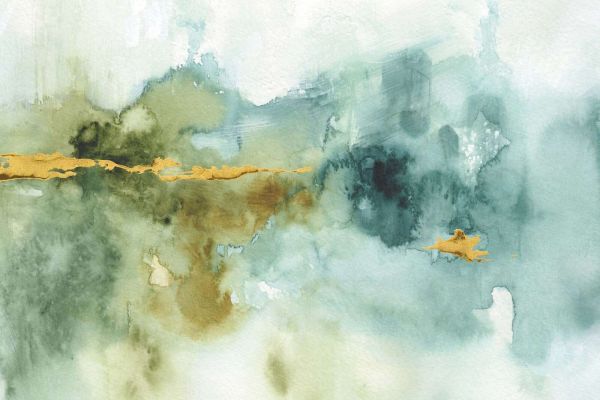 Een dromerige aquarelcompositie in groen- en blauwtinten, doorkruist door een sierlijke, goudkleurige lijn. Het ontwerp straalt rust uit en heeft een organische, natuurlijke beweging.