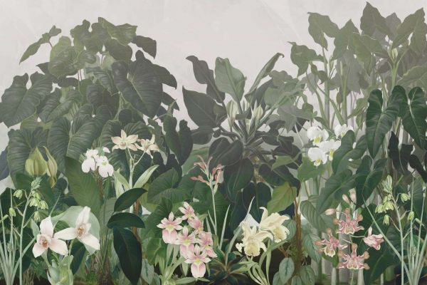 Deze ontwerpen ademen de rijkdom en diversiteit van tropische landschappen. Grote, levendige bladeren vormen een dichte achtergrond, waarin delicate bloemen zoals orchideeën subtiel naar voren komen. De combinatie van diepe groentinten en zachte pastelaccenten creëert een perfecte balans tussen robuuste natuur en verfijnde elegantie. Het kleurgebruik, variërend van subtiele sepia-tinten tot frisse blauw- en groentinten, voegt een serene en uitnodigende sfeer toe.