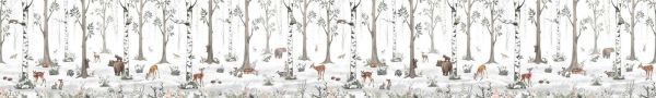 Deze rustgevende illustratie toont een verstild berkenbos vol dierlijk leven, afgebeeld in zachte, natuurlijke tinten. Tussen de slanke witgrijze boomstammen bewegen zich nieuwsgierige herten, spelende berenwelpen, scharrelende dassen en rustende vossen. Ook eekhoorns, konijntjes, vogels en een uil brengen leven in dit kalme boslandschap. Onderaan zorgen wilde bloemen, varenbladeren en grassen voor een subtiel kleuraccent in zachte pasteltinten.