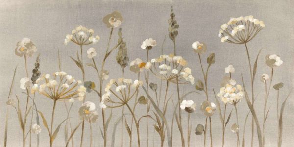 Dit ontwerp toont een dromerige verzameling veldbloemen, subtiel met de hand geschilderd in een rustgevend kleurenpalet van beige, crème, lichtgrijs, en zachte okergeel. De bloemen – waaronder schermbloemen en tere stelen met bloemknoppen – lijken te zweven op een effen grijsbeige ondergrond, wat het geheel een zachte, haast poëtische uitstraling geeft. De verfstructuur en het linnen-achtige effect in de achtergrond zorgen voor een gevoel van diepte en textuur, zonder overweldigend te zijn.
